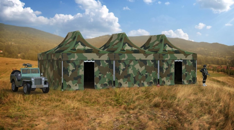 Fabrication sur mesure de tentes pliables à usages militaires, entièrement personnalisable au niveau des impressions des murs et de la toiture.